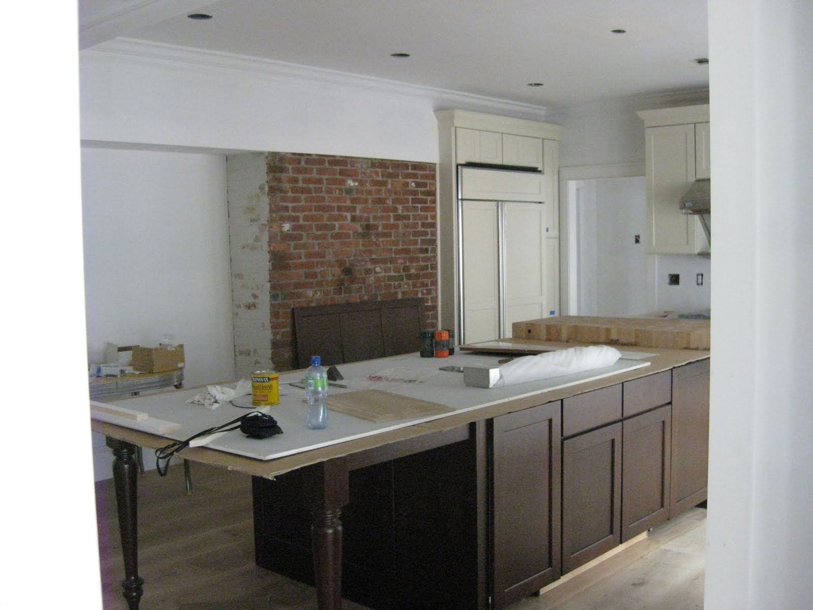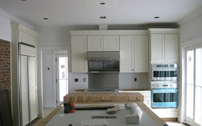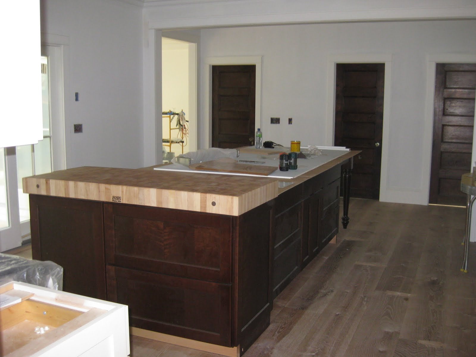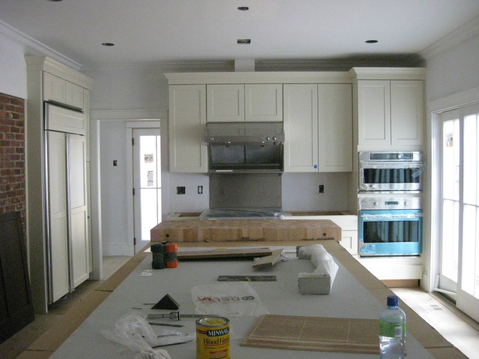Starting with the Kitchen... The appliances are all in and hooked up (including a last minute dishwasher substitution), the butcher block and crown molding have been installed, and the soapstone countertops have been templated and will probably be installed by our next posting. Here are some pictures: