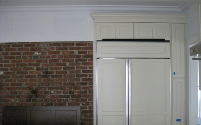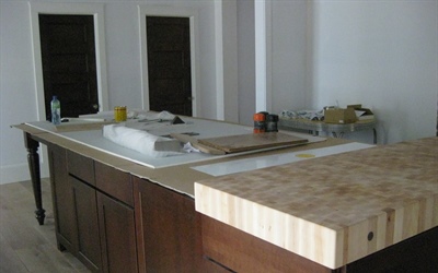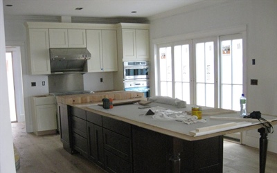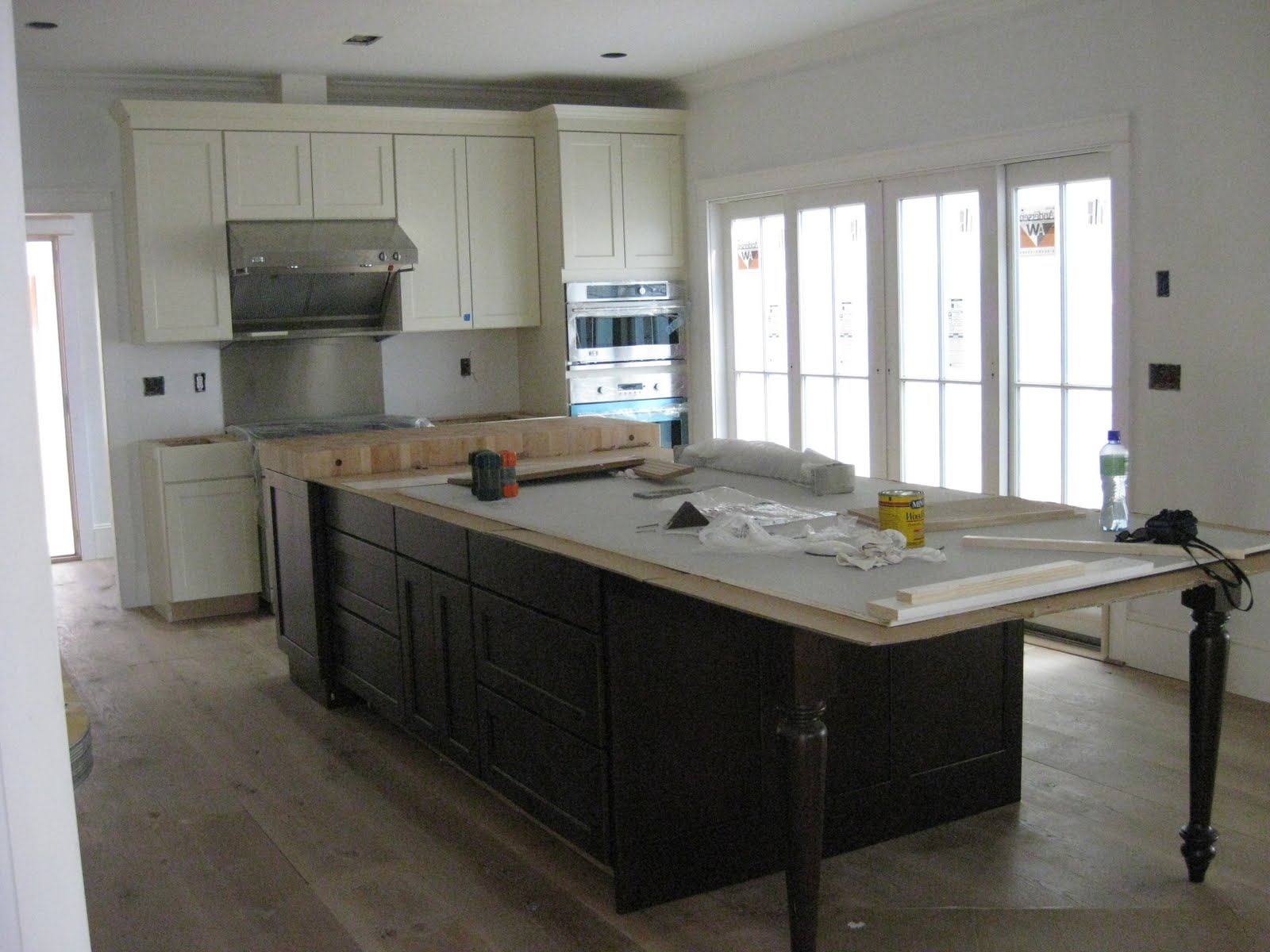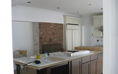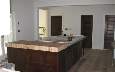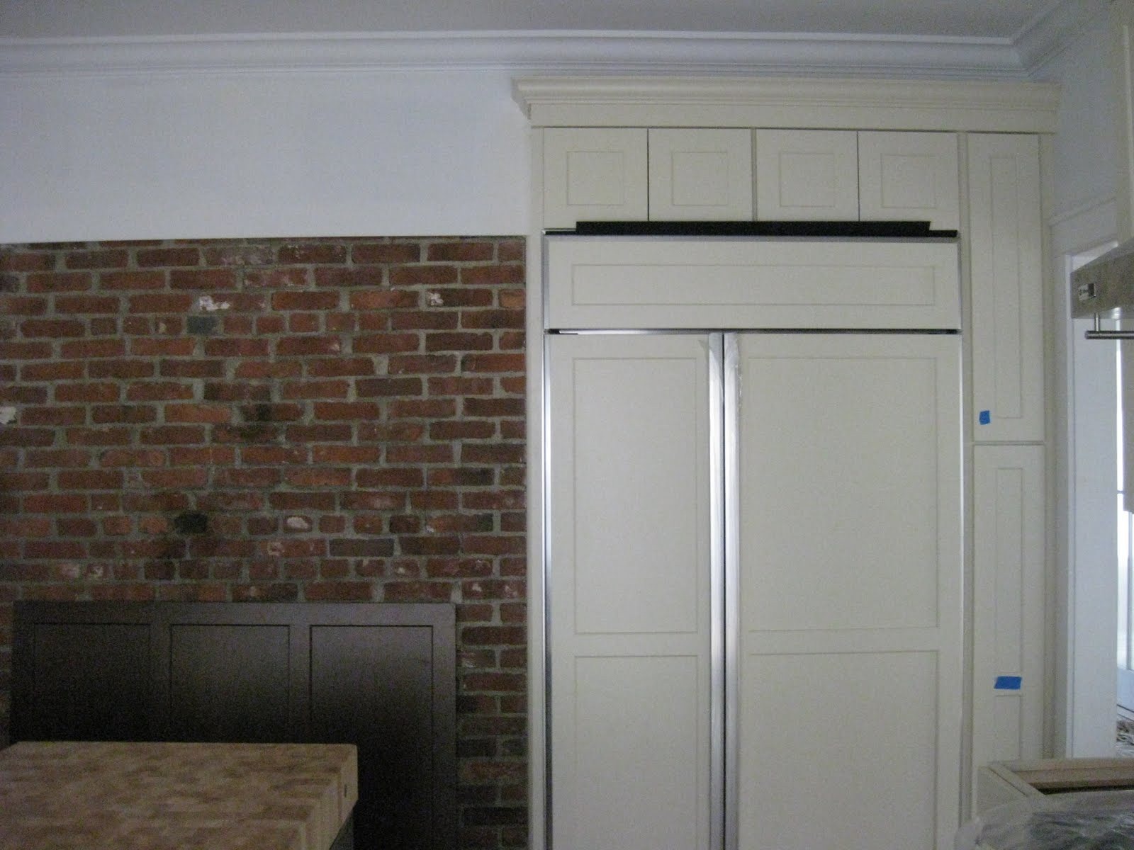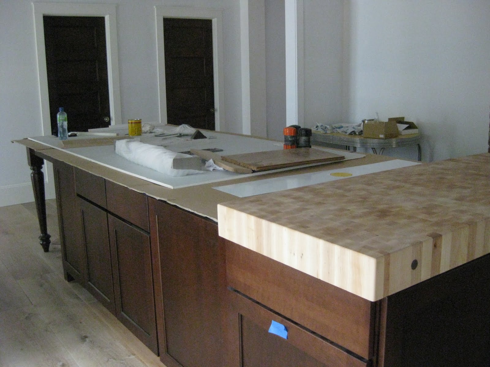 Starting with the Kitchen... The appliances are all in and hooked up (including a last minute dishwasher substitution), the butcher block and crown molding have been installed, and the soapstone countertops have been templated and will probably be installed by our next posting. Here are some pictures:
