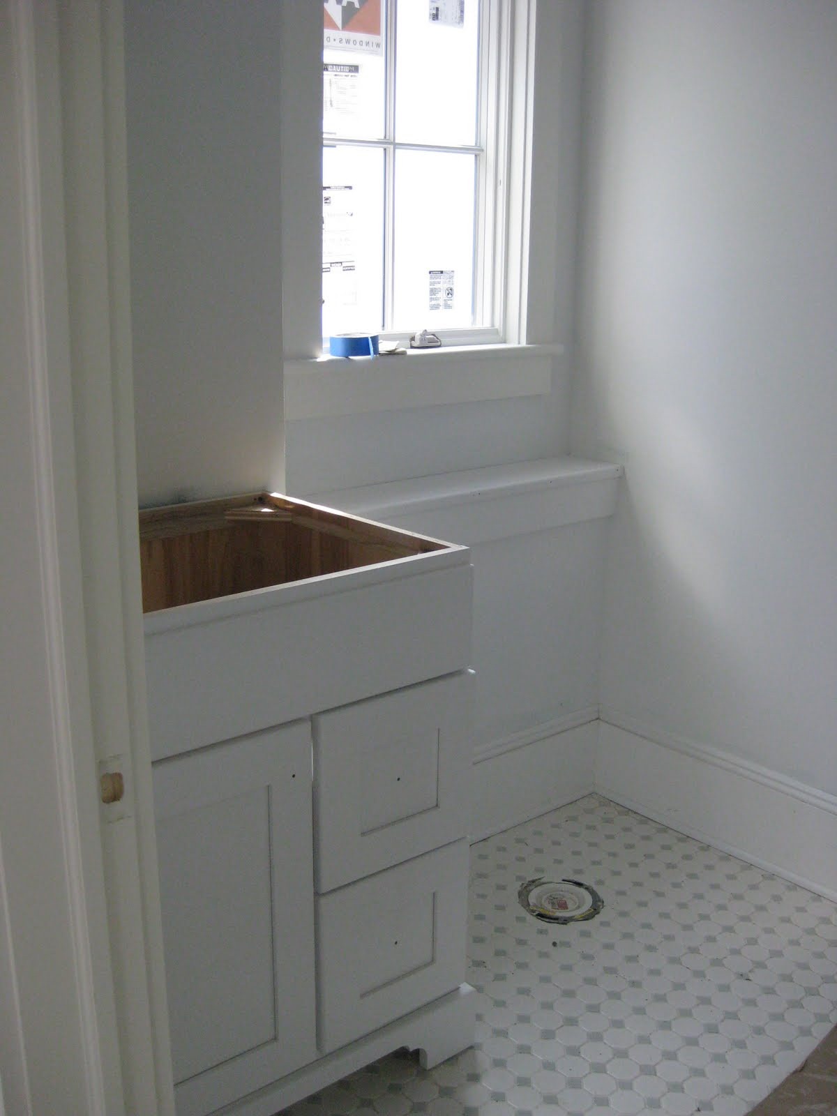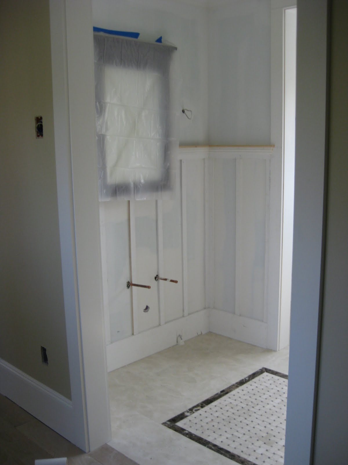 On the Bathroom front, the wainscoting is installed in our bathroom and in the guest bathroom the vanity and tile have been installed: