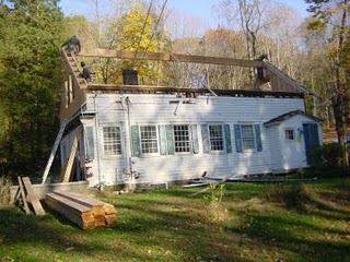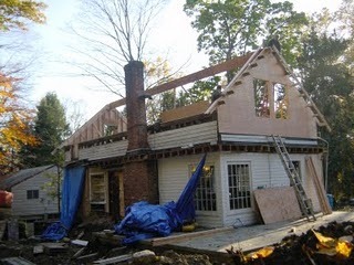 Wow... lots of progress today. In fact, I can't believe it is less then 24 hours since I stood in our old living room last night listening to the rain dripping through the tarp (and it was a lot of rain!) Today, we have the gable walls framed and the ridge beam installed.