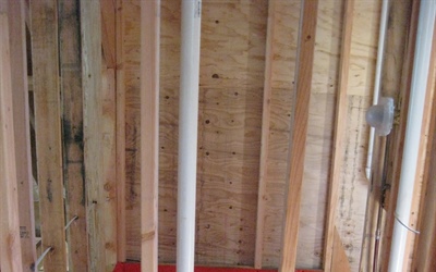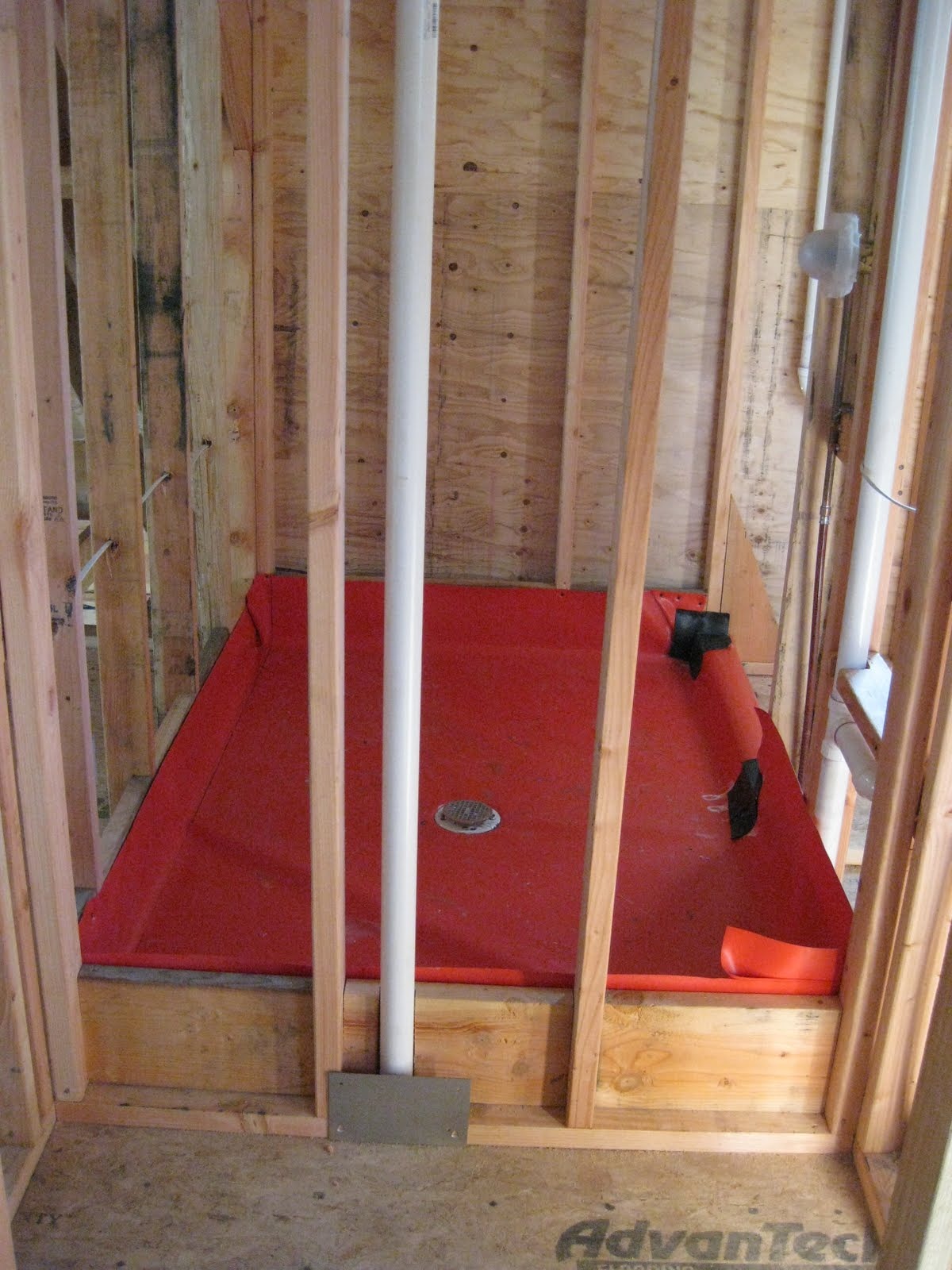 Inside we passed the rough in inspections for plumbing, electric and mechanical. Here is the underlayment of what will be our shower: