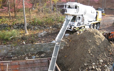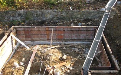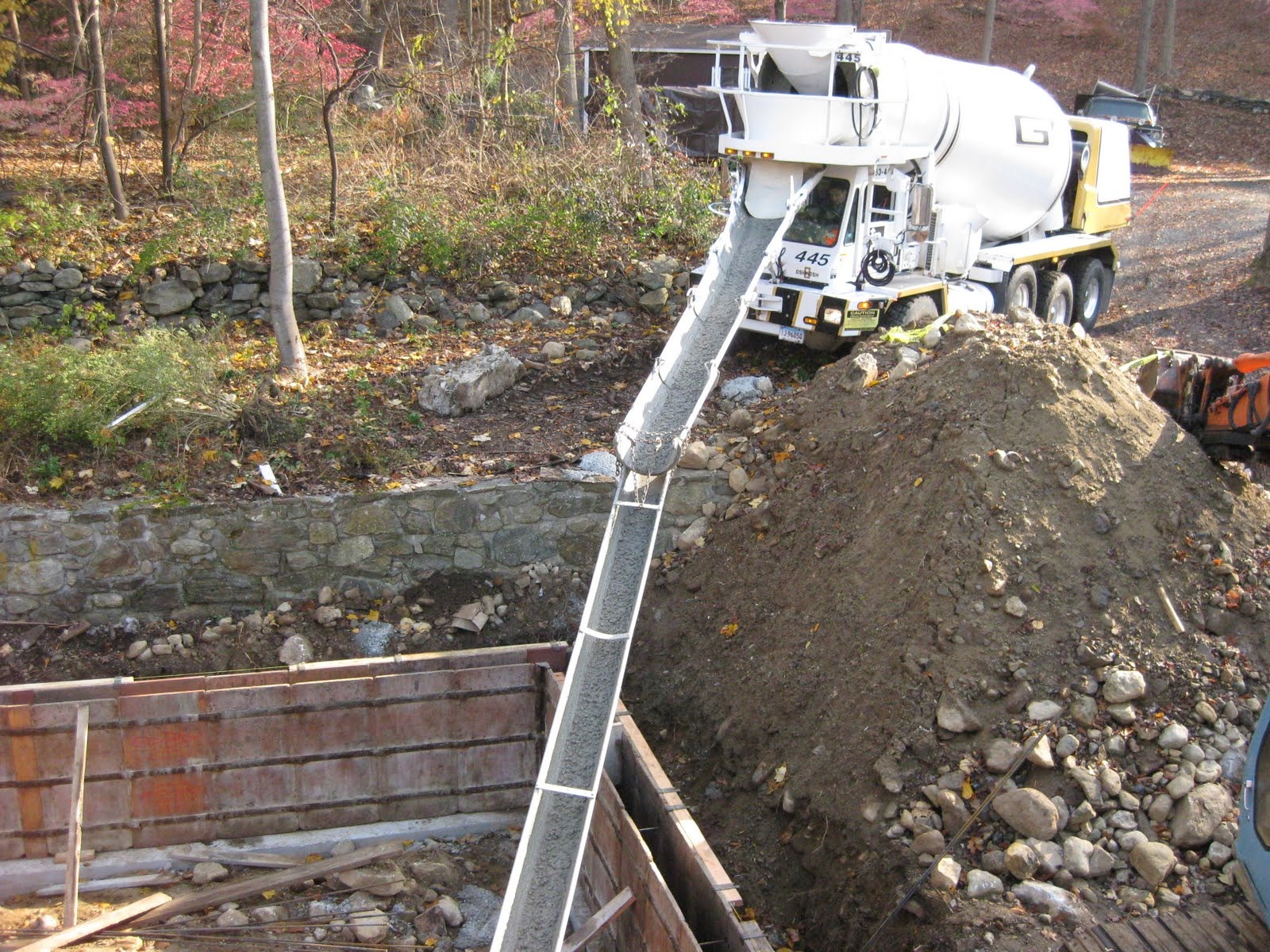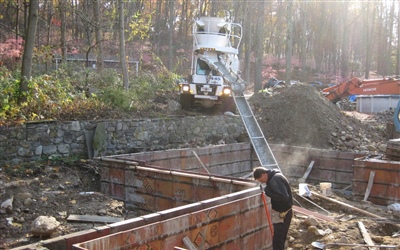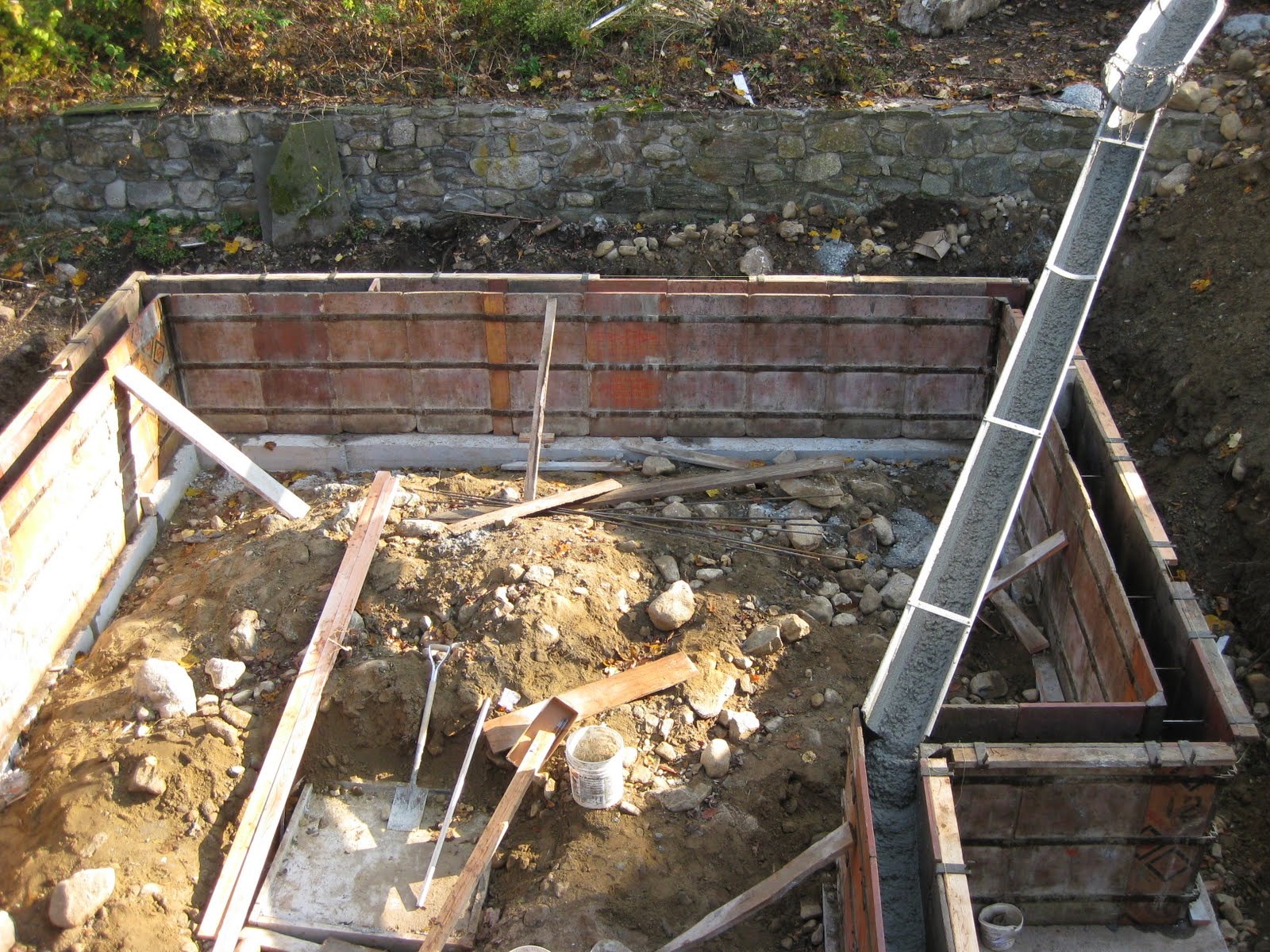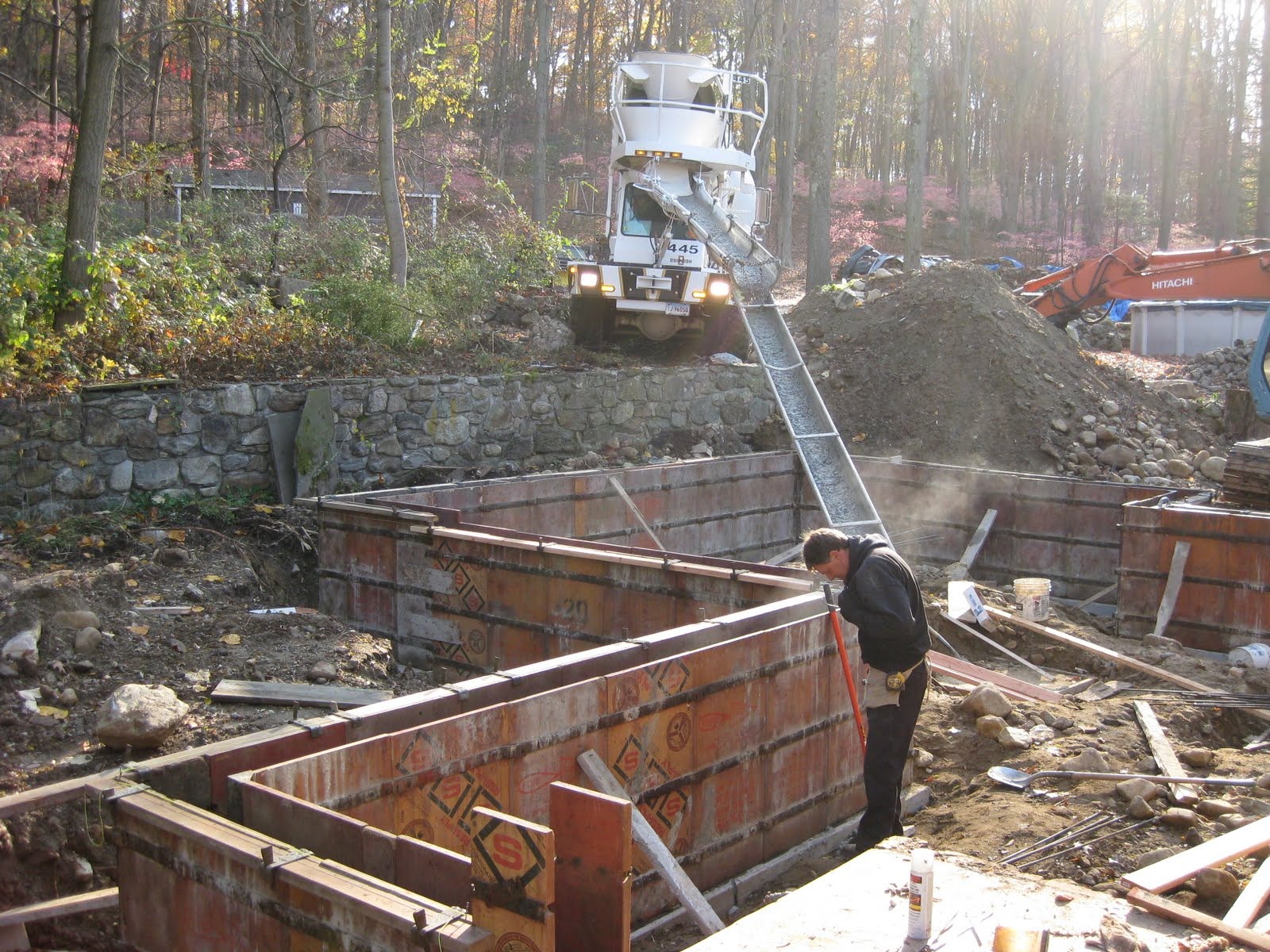 I am going to break all of the photographs from today's exciting job meeting up into a couple of posts. This one is about the foundation work that is taking place in the back of the house. Here are some shots of the forms in place and the concrete being poured. Much thanks to our neighbors for allowing us to bring the cement truck up through their yard!