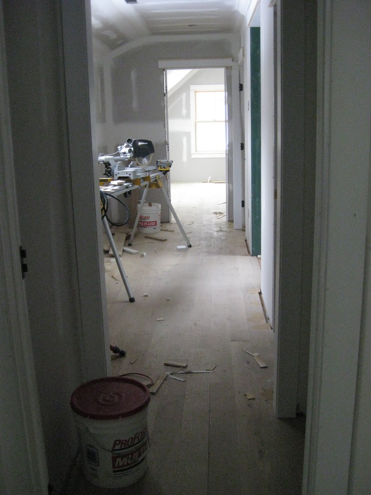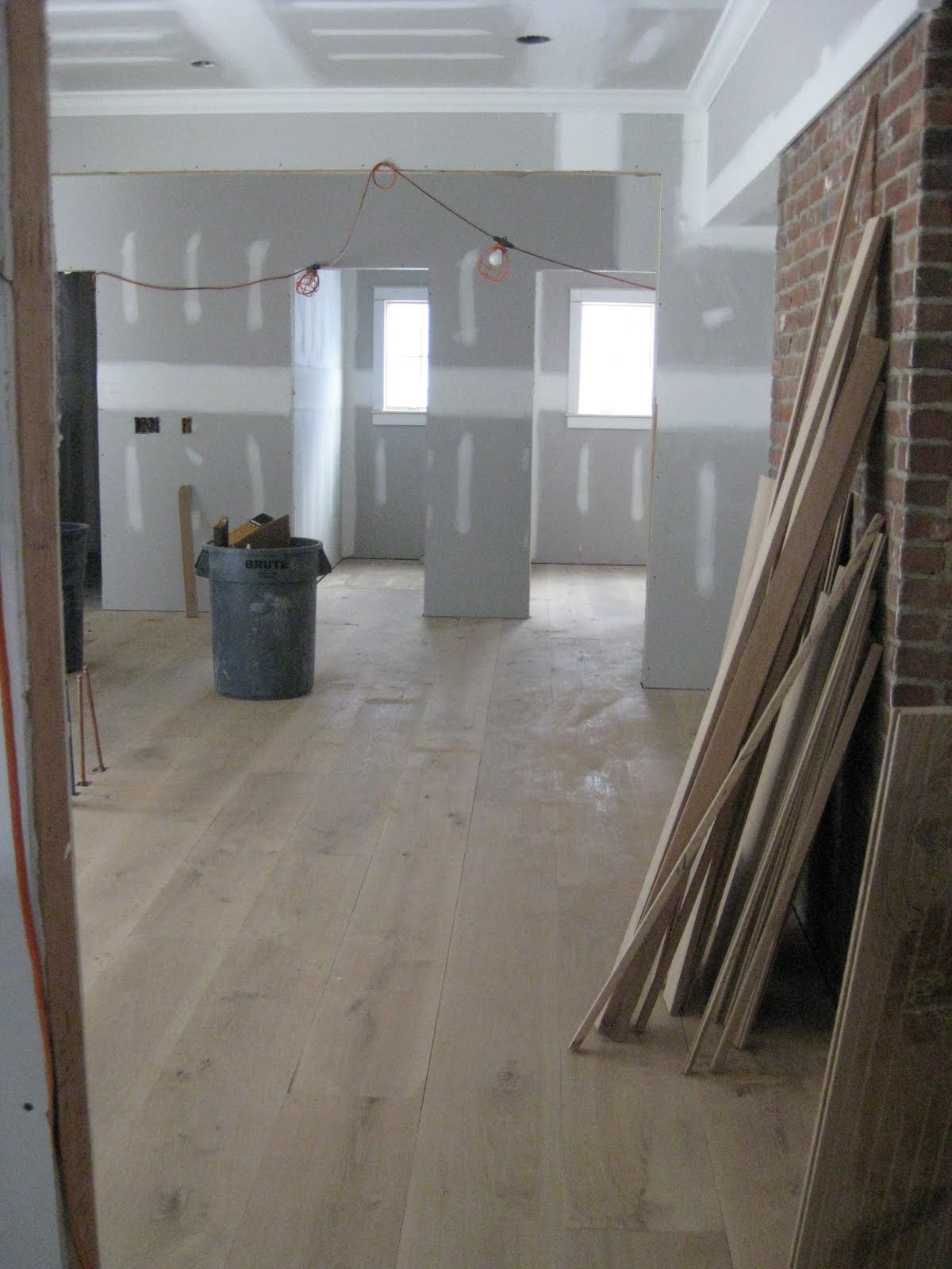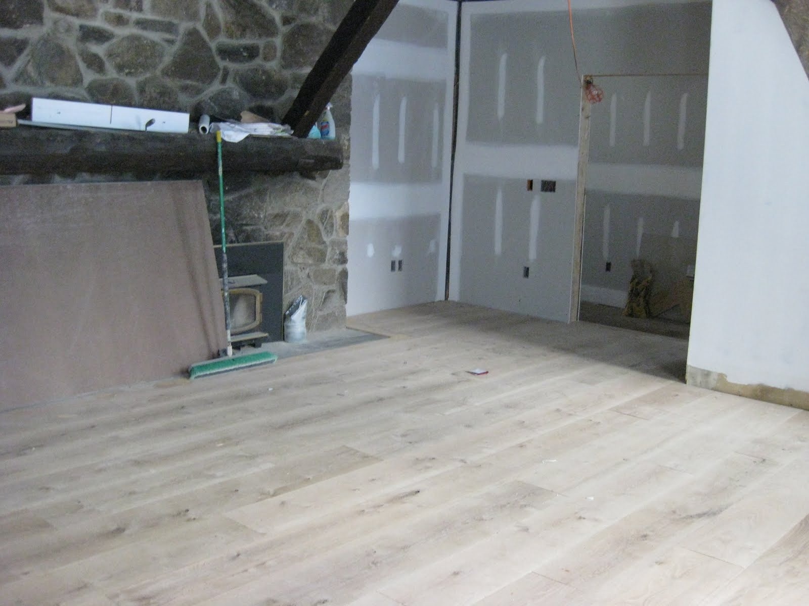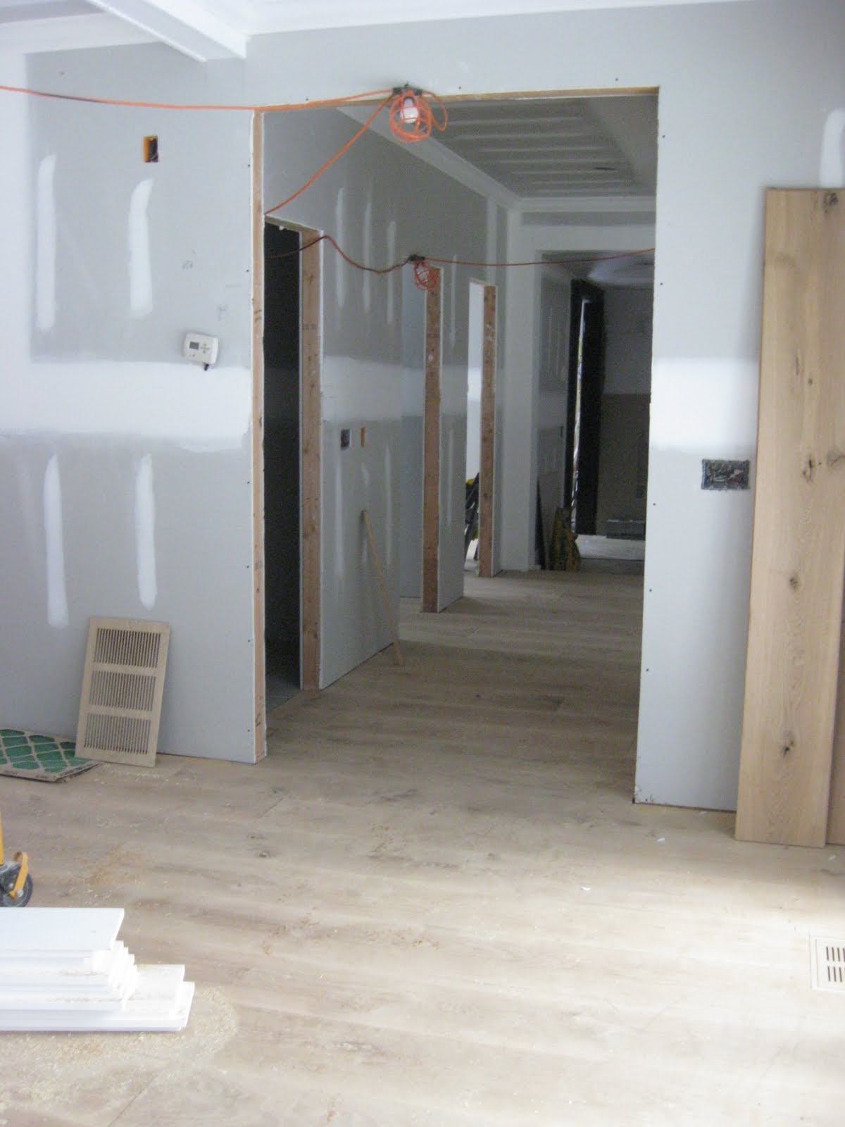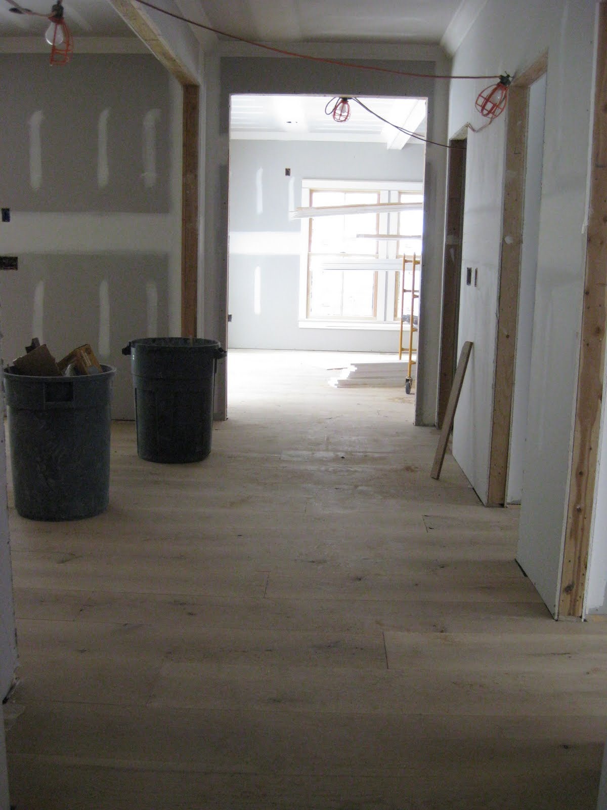 This week begins the 5th month since construction began. We had been a way for a few days, but were anxious to get to the house this morning to see how much progress was made with the wood flooring. It had been a rainy/ snowy/ rainy end to last week, so we were not sure if that would have any impact on the schedule. It turns out the answer was a resounding no, as all of the wood has been installed and it looks GREAT!