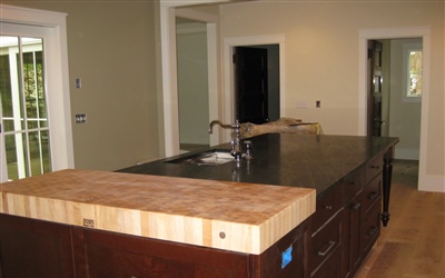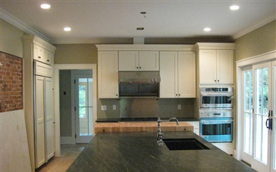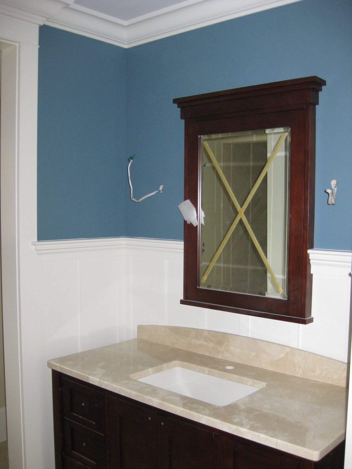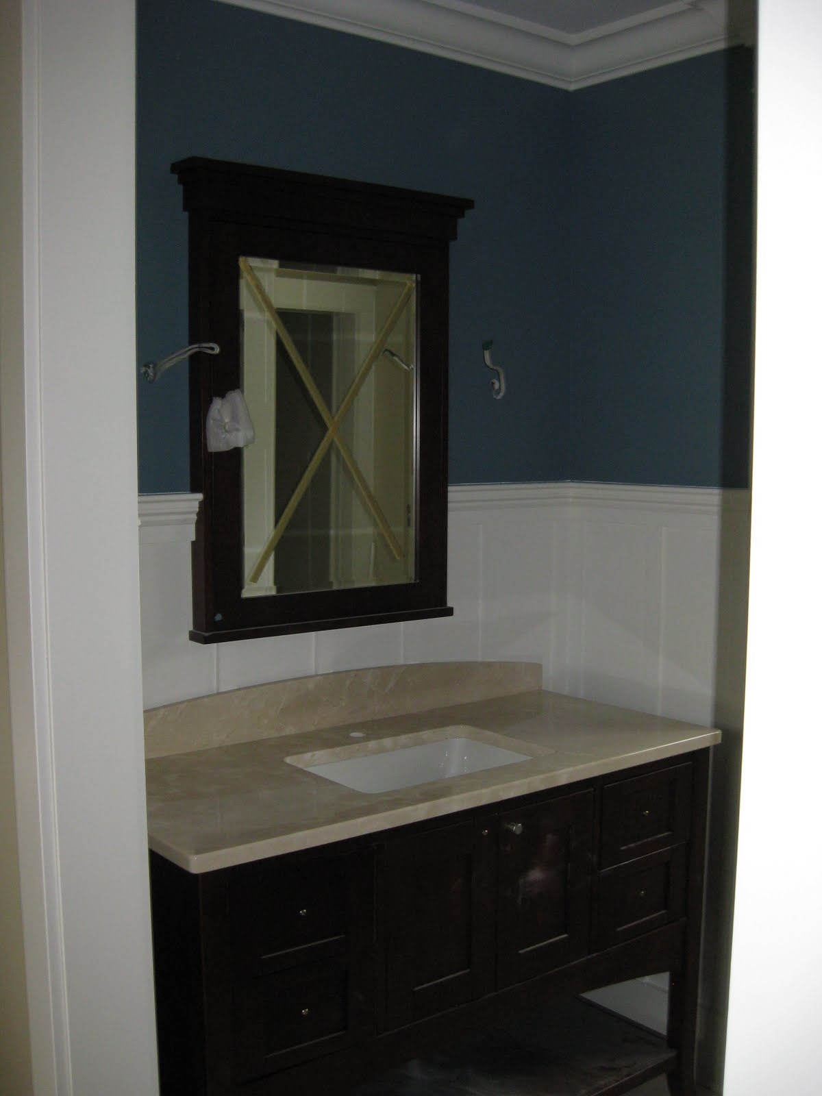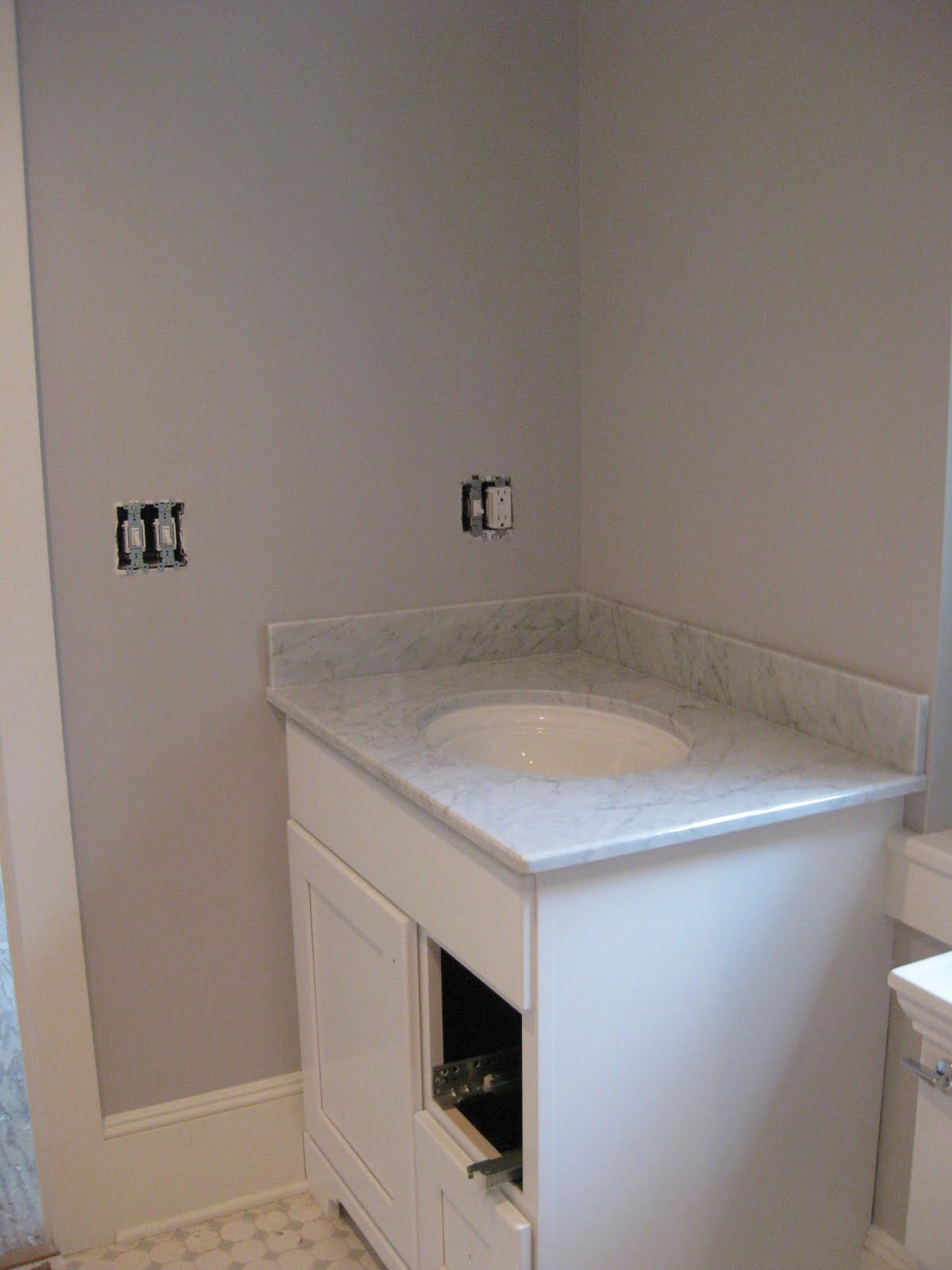 With every step the house starts to look more and more ready to live in. Now, with the countertops in and 95% of the interior painted, it would seem like we are just moments away from living there. Here are pictures of the Kitchen, Master Bathroom, and Guest Bathroom: