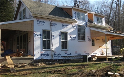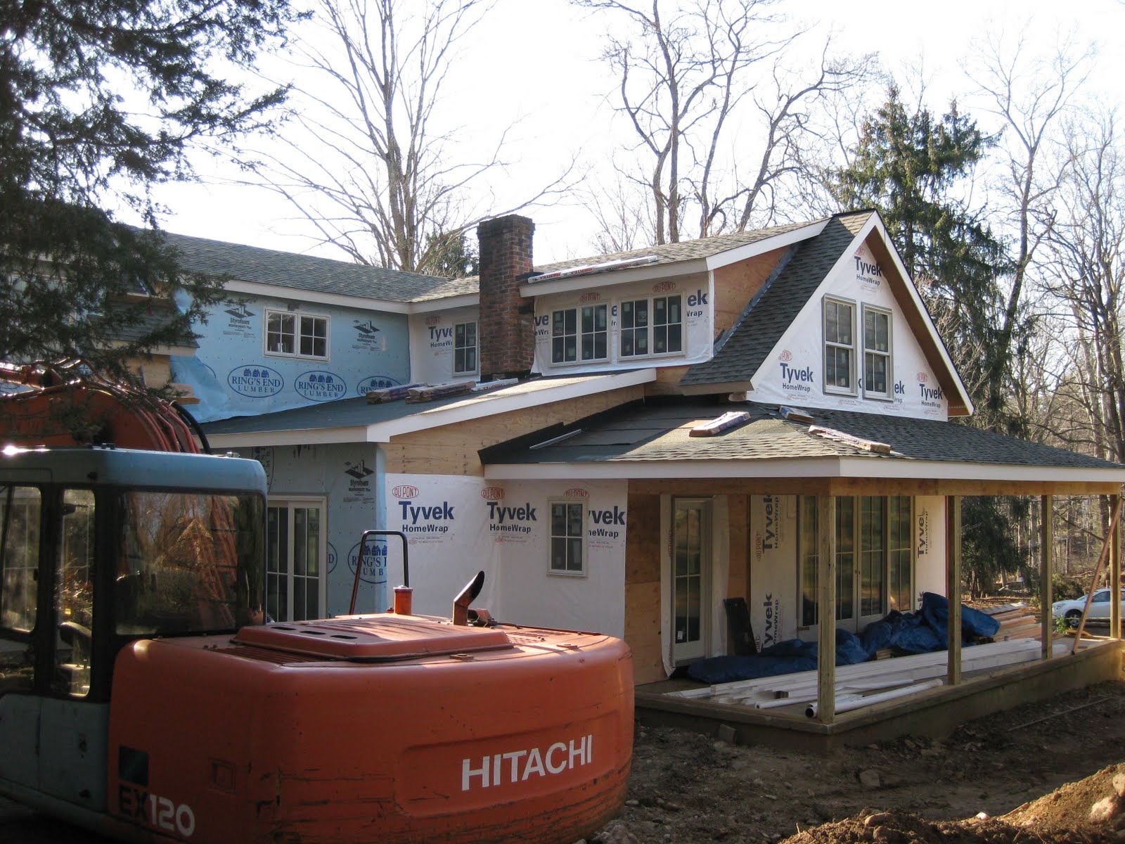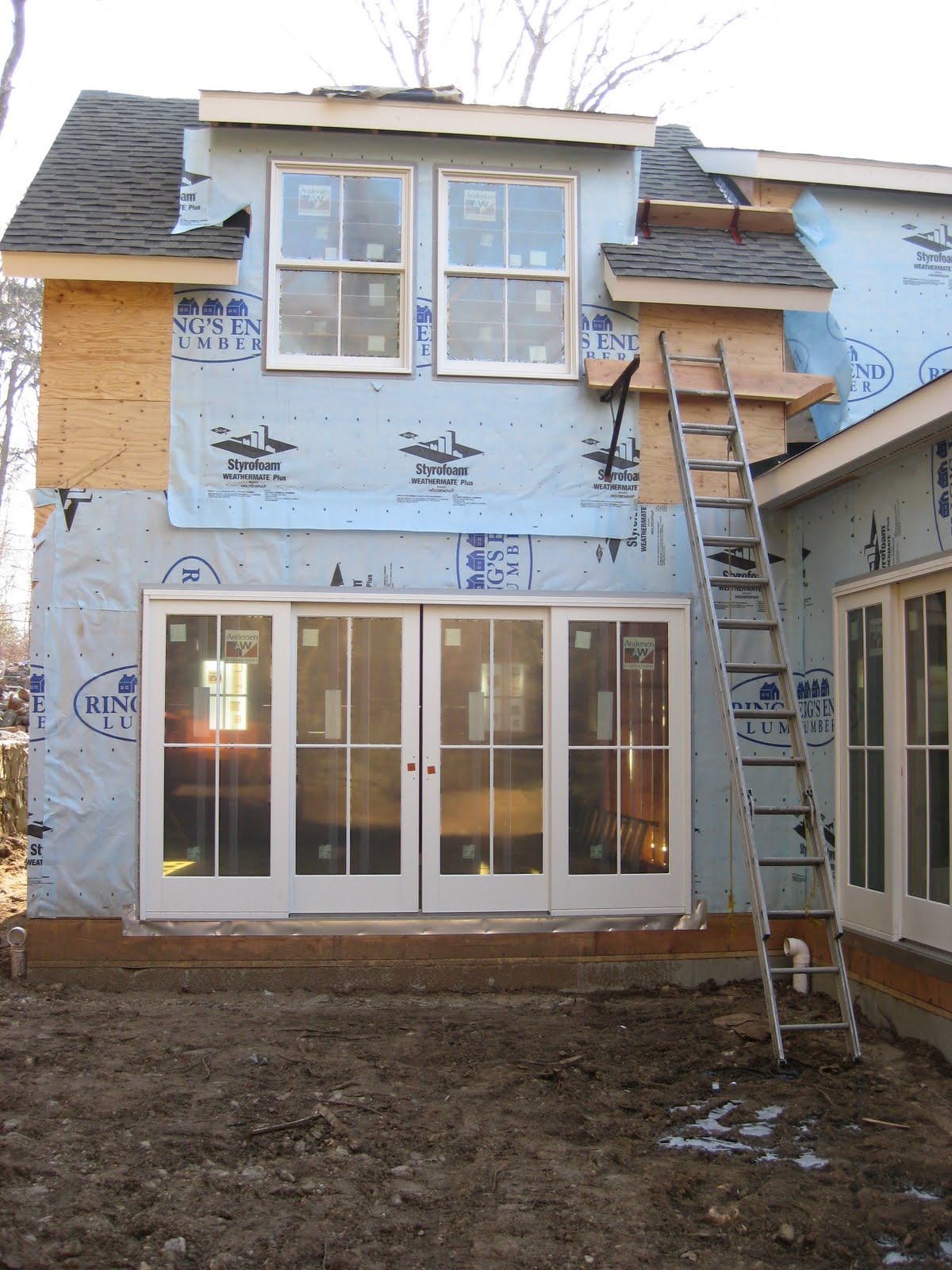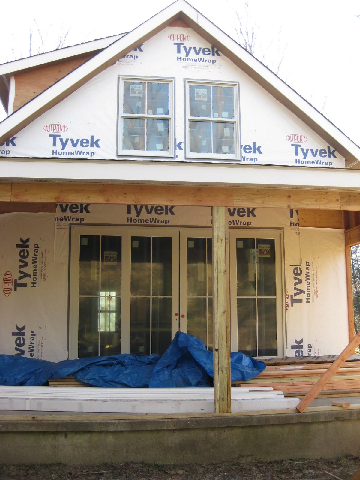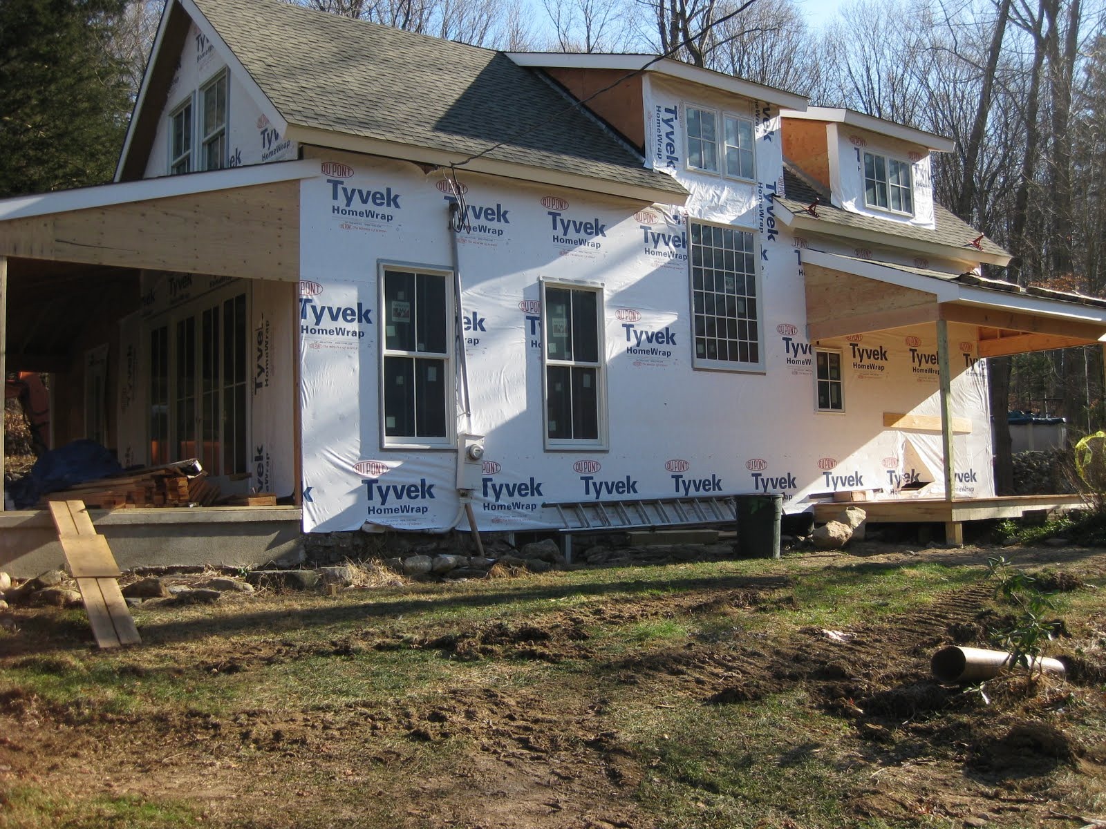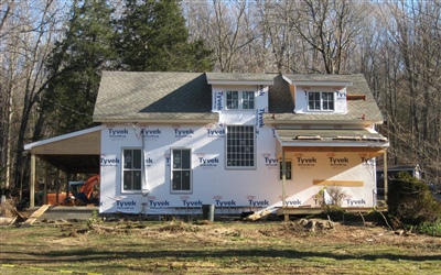 First Exterior Shots; the porches are all framed and floored, windows and doors are installed (except the front and side entry doors, but we dragged our feet on choosing those) and now you can finally see what the White Mill will look like when done... Just siding and trim left!