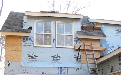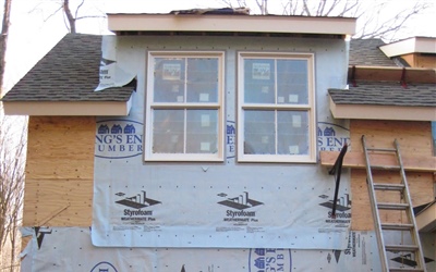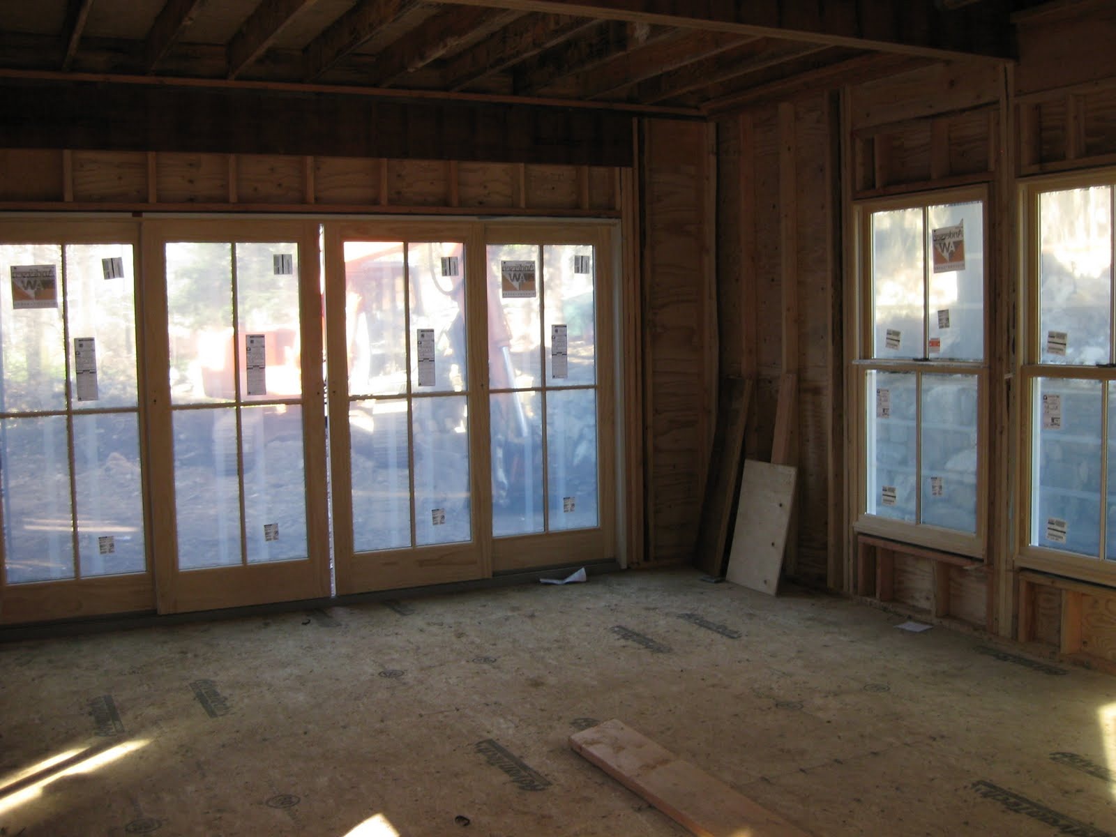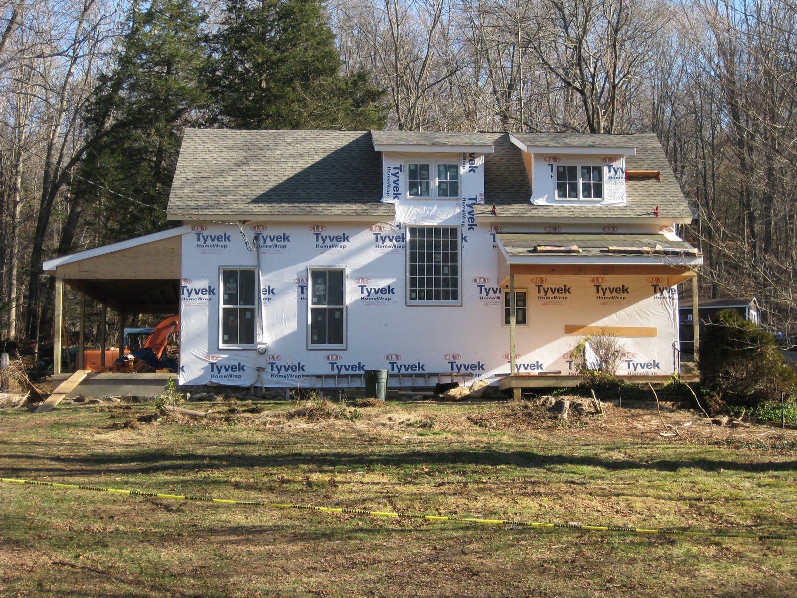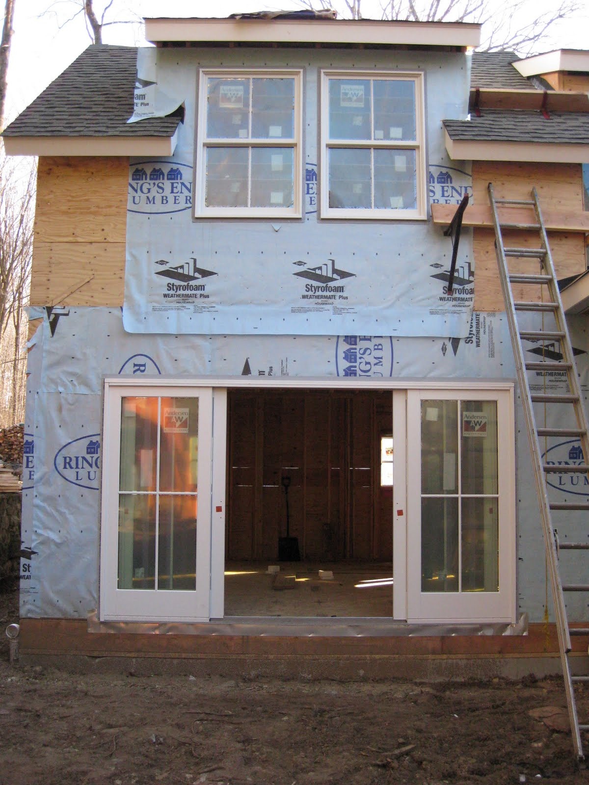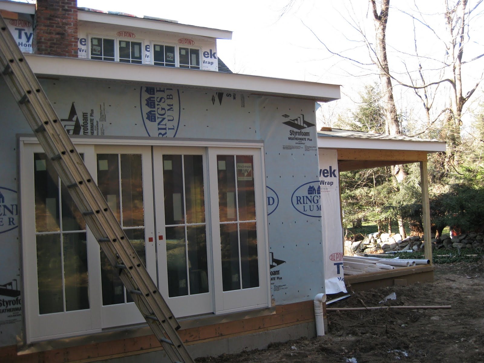 First Exterior Shots; the porches are all framed and floored, windows and doors are installed (except the front and side entry doors, but we dragged our feet on choosing those) and now you can finally see what the White Mill will look like when done... Just siding and trim left!